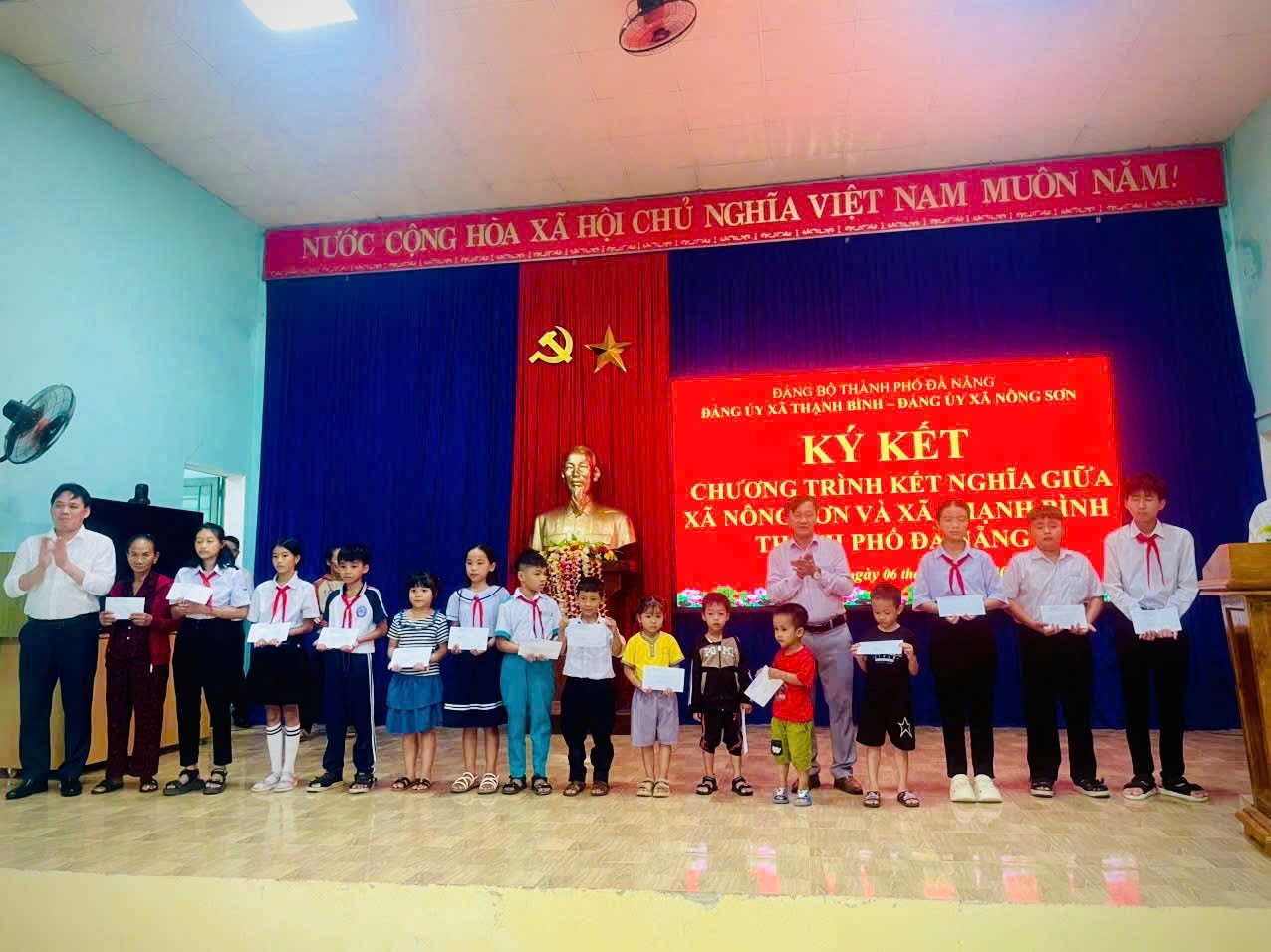 Nhân dịp này, Đảng ủy xã Nông Sơn đã trao 20 suất quà cho học sinh nghèo vượt khó trên địa bàn xã Thạnh Bình, thể hiện tinh thần tương thân tương ái và gắn kết giữa hai địa phương.