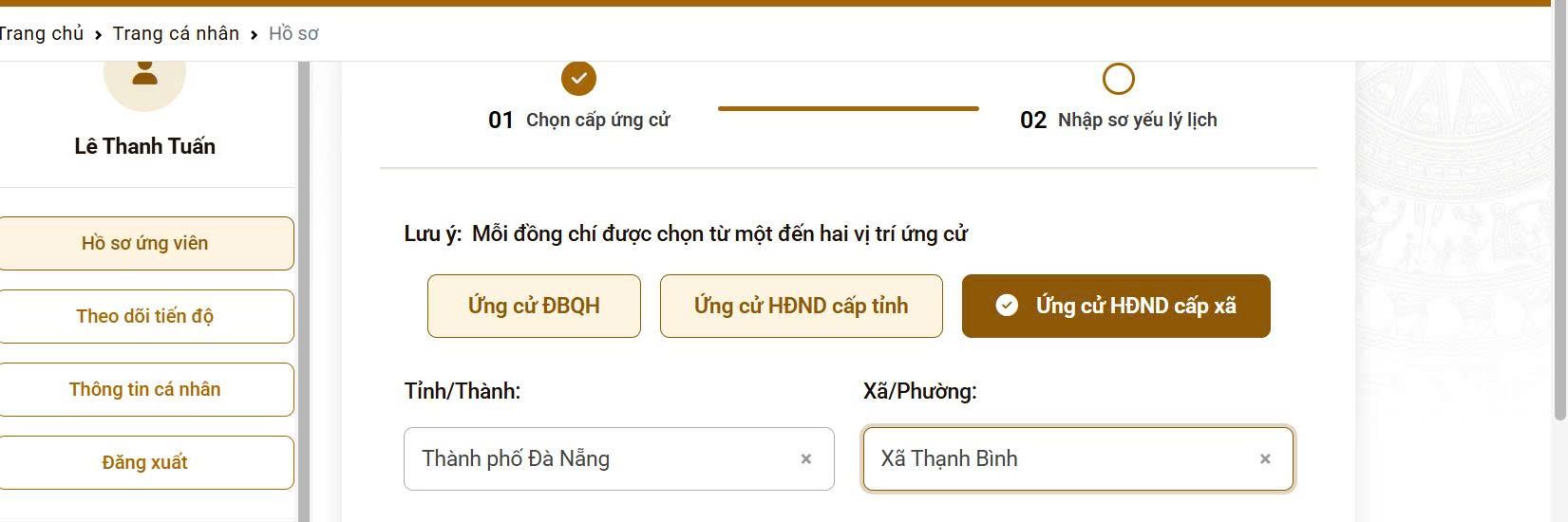 - Bước 5: chọn Ứng cử hội đồng nhân dân cấp xã/phường, chọn xã Thạnh Bình và ấn chọn Tiếp tục.